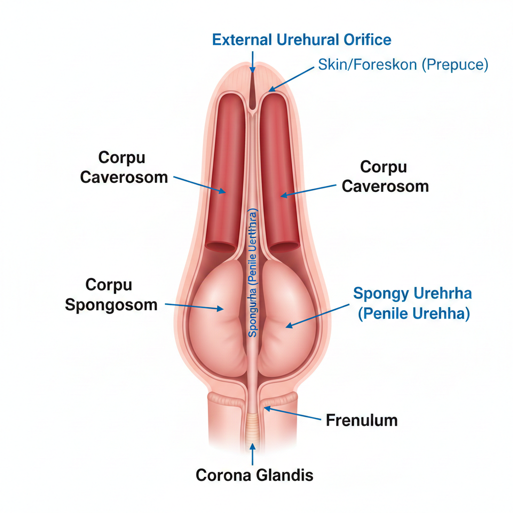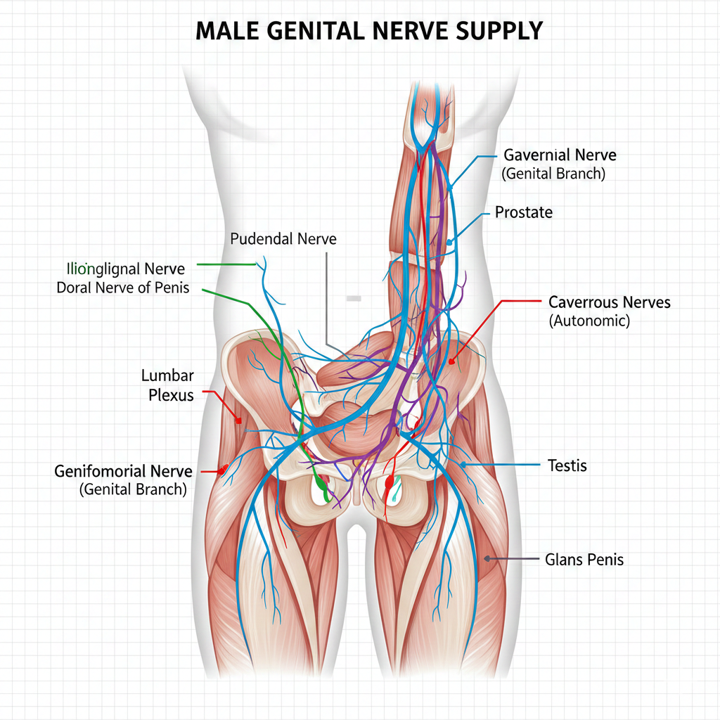 The glans penis contains a dense concentration of sensory receptors supplied primarily by the dorsal penile nerve. Reduced sensory thresholds or inflammatory signaling may contribute to heightened excitatory input and earlier reflex activation.